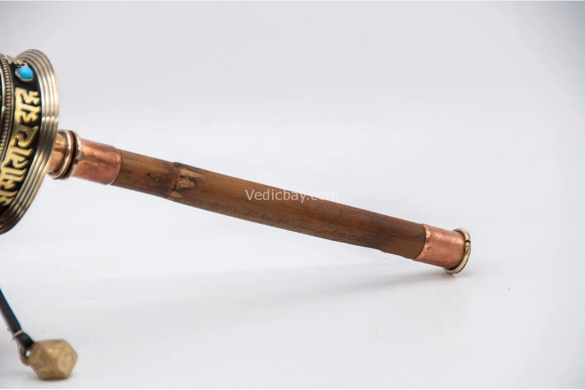 Mounted on a natural cane bamboo handle, the wheel spins effortlessly when turned clockwise. Inside the hollow cylinder lies a long roll of sacred mantras, activated with every rotation to spread spiritual blessings. A brass bob, attached with a chain, helps maintain the momentum as the wheel turns.