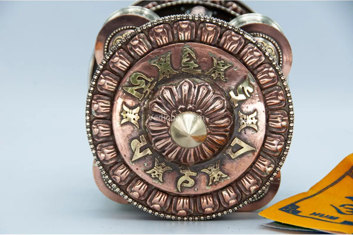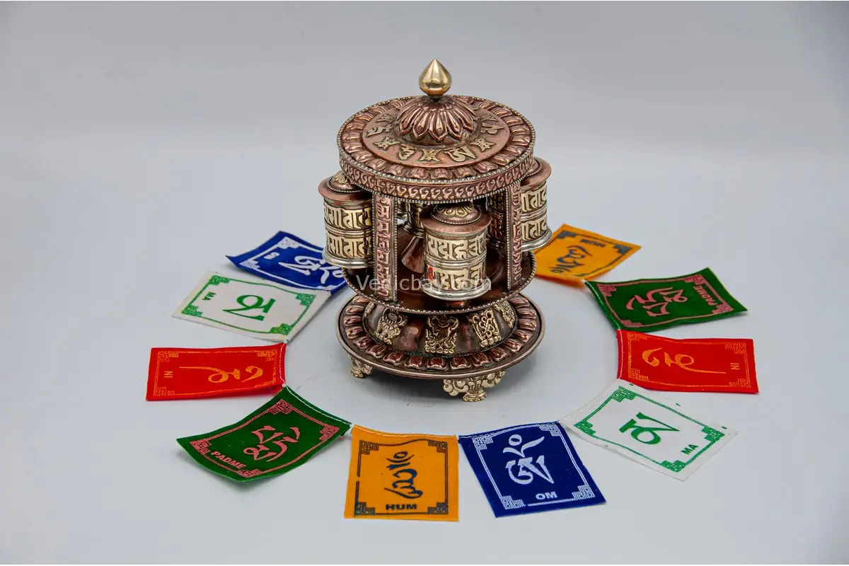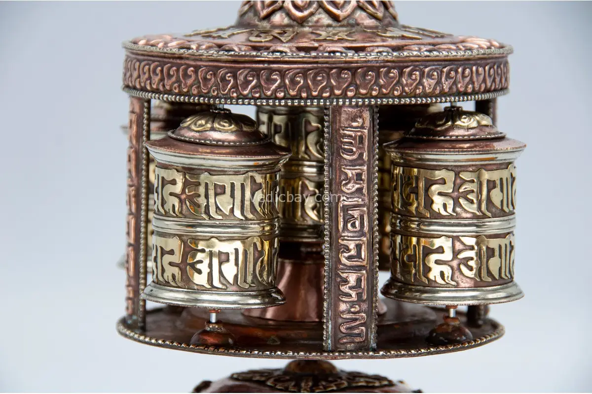 - Wheels: 5 copper prayer wheels with internal mantra scrolls