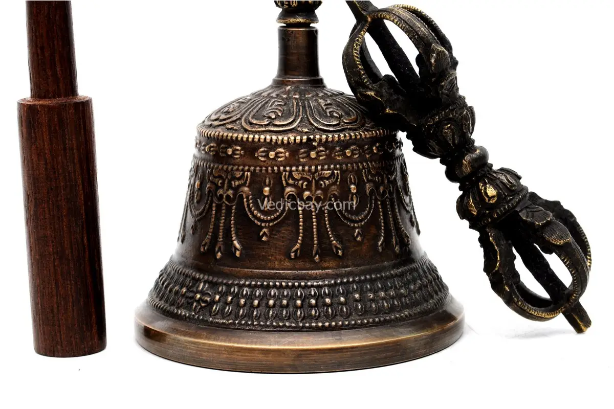 The bell stands approximately 6 inches tall and 3.5 inches wide. It features elegant hand carvings, symbolic drape patterns, and a richly detailed dorje handle. The set includes a matching bronze dorje (vajra) and a smooth wooden mallet—all handmade in Nepal by skilled artisans.