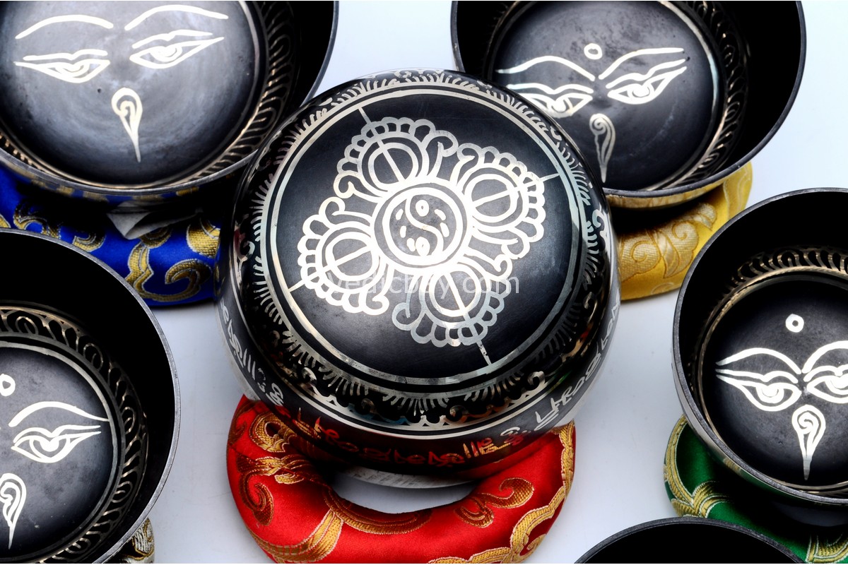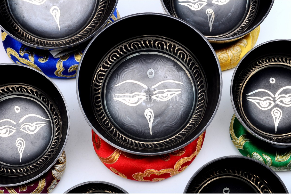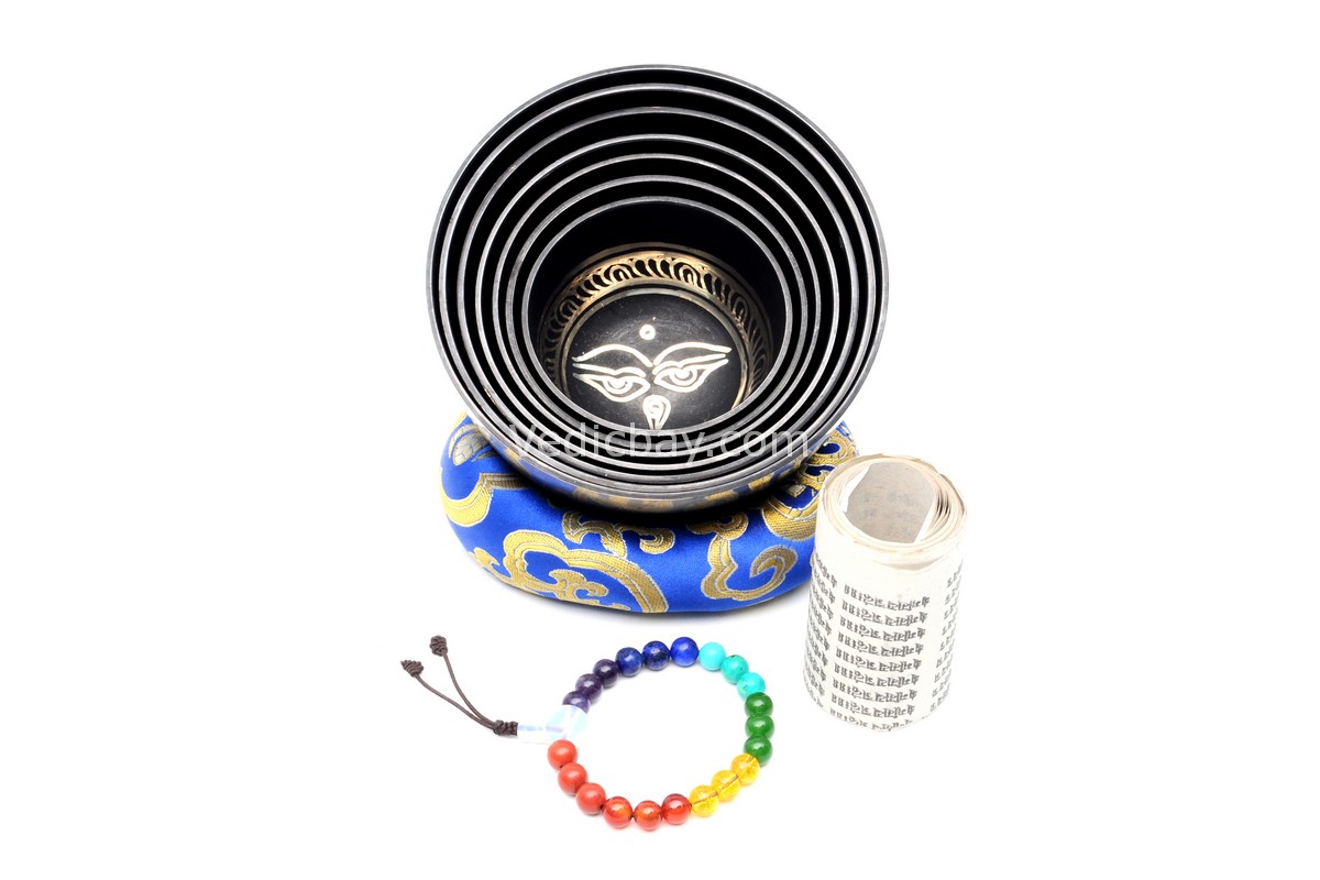 7 Chakra Handmade Singing Bowl Set of 7 β Black Painted with Buddha Eyes & Tibetan Mantra β Handmade in Nepal