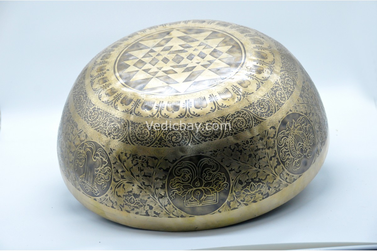 Large Foot Carved Singing Bowl – 7 Chakras & Shree Yantra – Handmade Sound Healing Bowl from Nepal