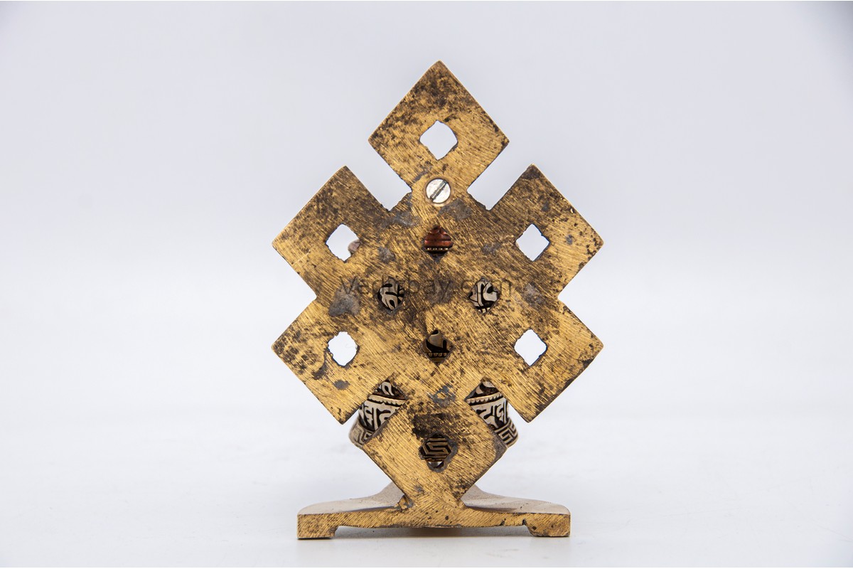 This 5-inch tall Dharma Wheel Tibetan Prayer Wheel is a sacred handmade object crafted by skilled artisans in Nepal. It features a 4-line mantra embossed on its copper surface and rests on a sturdy brass base, making it perfect for tabletop use in meditation or spiritual rituals.