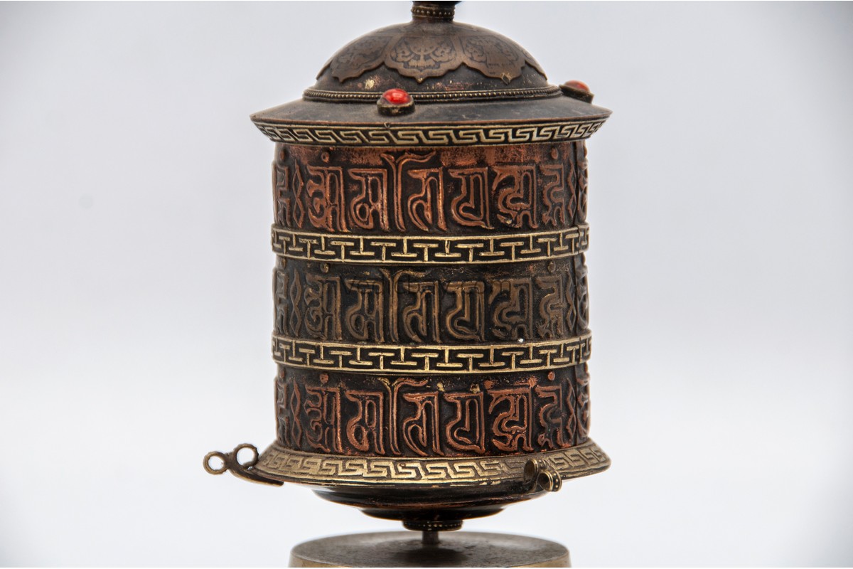 The outer surface of the prayer wheel features intricate brass work and traditional Tibetan motifs. Whether placed on your meditation altar, personal shrine, or simply in your sacred space, this prayer wheel serves as a visual and spiritual reminder of mindfulness, compassion, and peace.