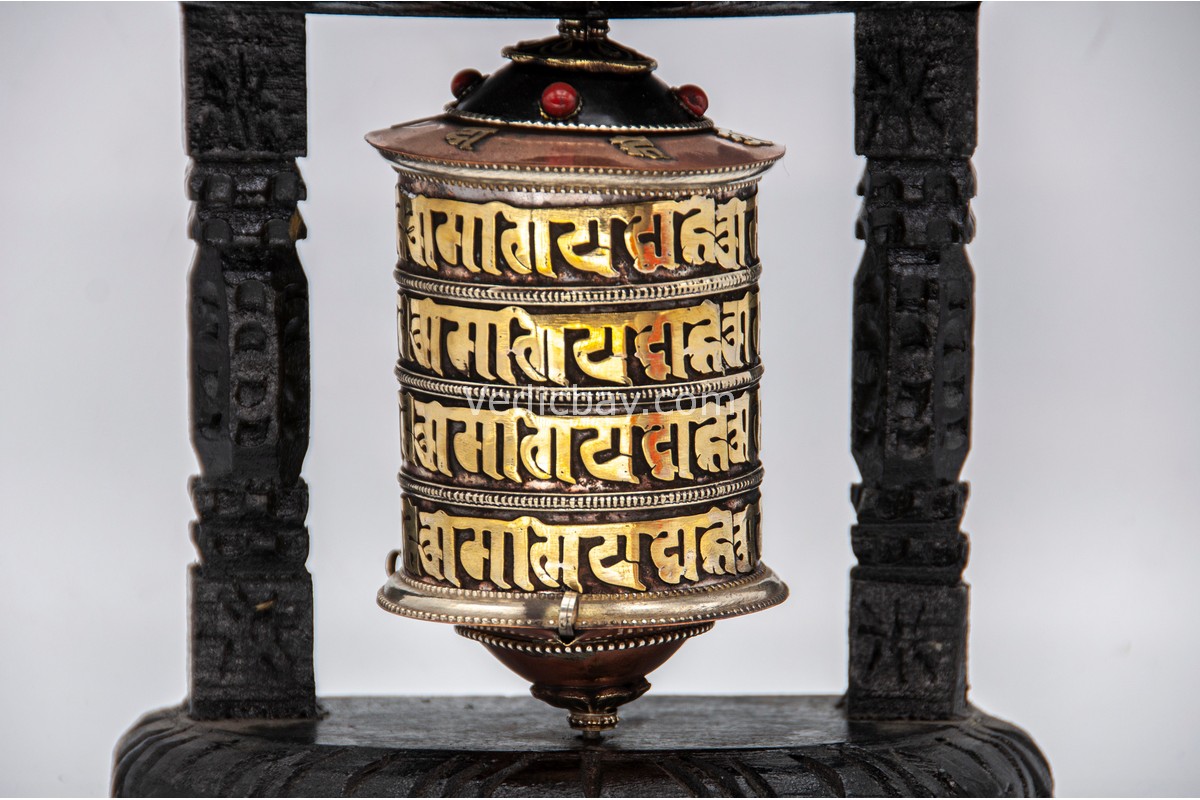 Each wheel is carefully handcrafted by Nepalese artisans in the Himalayan region, incorporating native copper, brass, and wood. The frame supports the spinning wheel securely, making it ideal for home altars, temples, or personal practice.