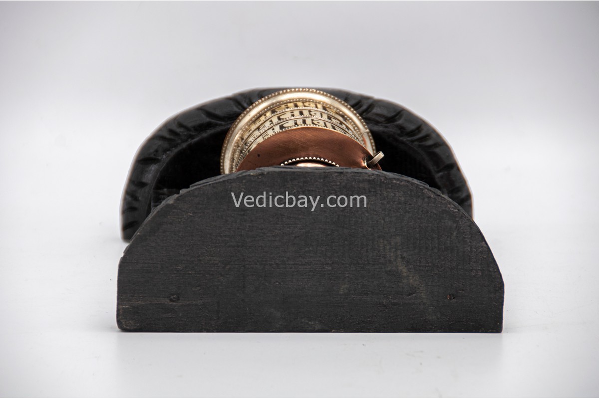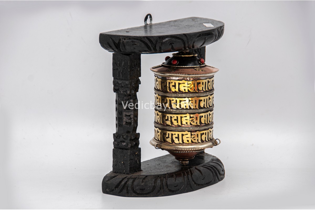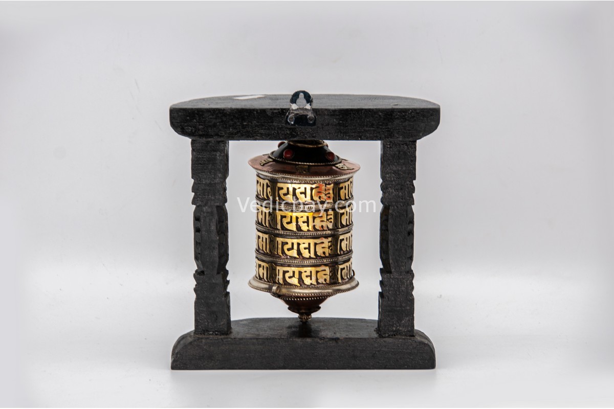- Material: Copper Wheel, Brass Mantra, Silver-Tone Casing, Wooden Frame
