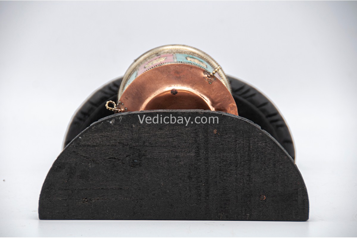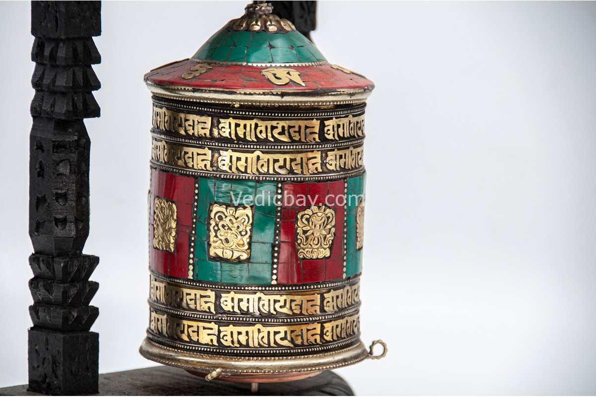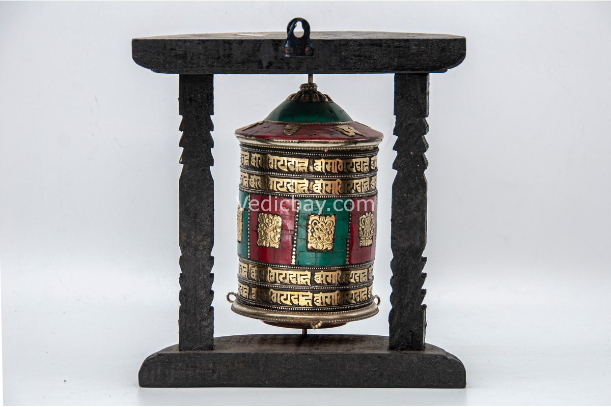 - Material: Copper prayer wheel, brass embossing, wooden frame